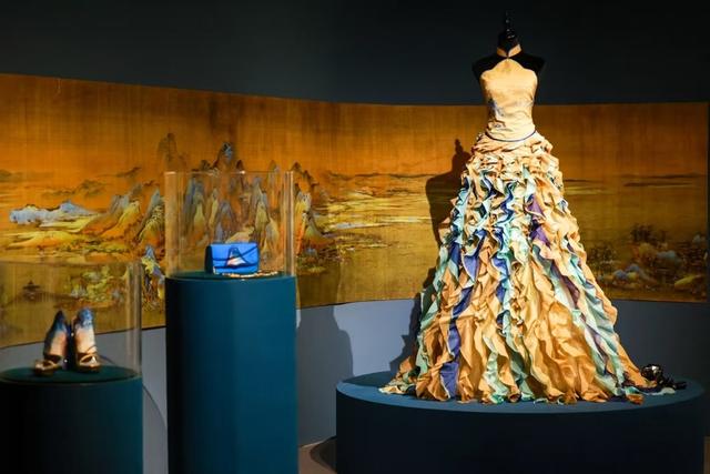 以《千里江山图》为灵感的《千里江山·翠履霓裳》系列,是本次展览的重磅展项。由非遗传承人和设计师跨界创作的缂丝高定女鞋、箱包和礼服,截取画中山水立体布局、色调及线条,充满诗情画意。