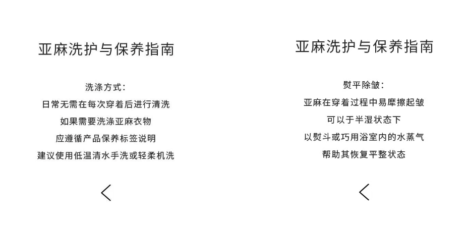 诚如一个平替应该做的那样,COS的亚麻保养起来可以说是永绝后患级别。材质上不乏加入了棉等其他面料混纺的,看起来也是那个松散垂坠的意思,还能让面料整体更抗皱;熨烫也不用太费劲,其官方亚麻养护指南里提到,趁洗澡挂浴室里用水蒸气熏熏即可。