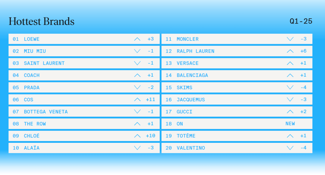 行走江湖多年的“高端快时尚”COS,挤进了全球时尚搜索引擎Lyst前阵子发布2025年第一季度热门时尚品牌榜单,排名第六,成为首个跻身该榜单前十的大众时尚品牌。在定价动辄上万的Miu Miu、Prada、巴黎世家之中,显得格外朴实。